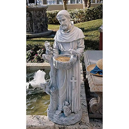 St. Francis of Assisi Garden Statue with Bird Feeder – Hand-Cast Religious Outdoor Decor in Antique White Stone Finish