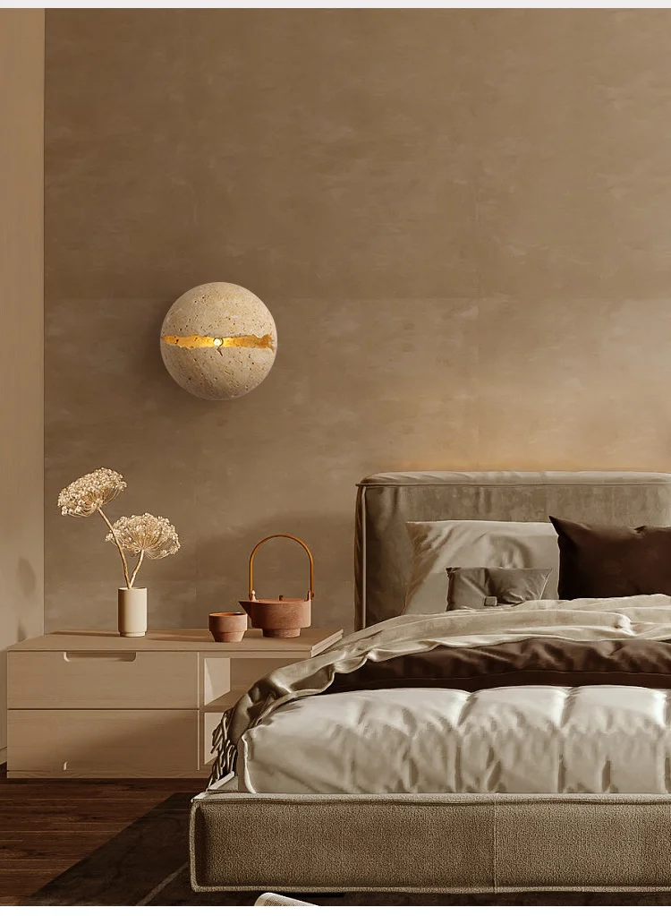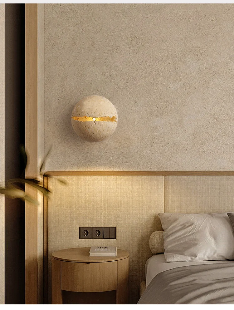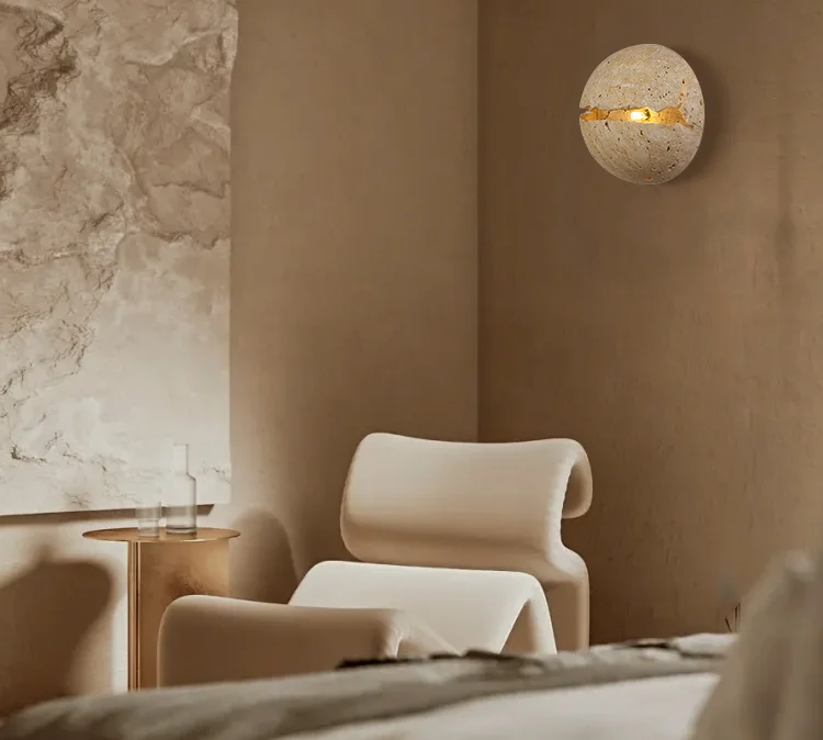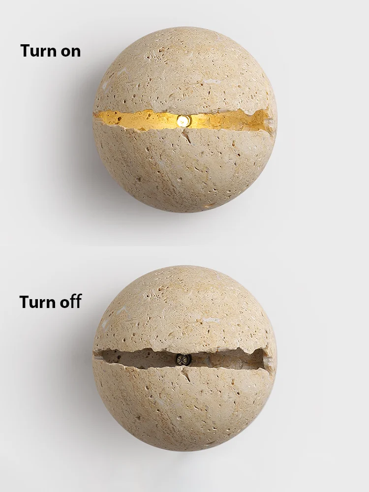 Enhance your interior with the Retro Dinosaur Egg Natural Stone Wall Lamp, a stunning fusion of nature and art. Crafted from premium Yellow Travertine, this hemisphere-shaped LED sconce adds warmth and elegance to any space. Its unique natural texture makes each piece one of a kind, perfect for living rooms, dining rooms, bedrooms, hallways, and corridors.